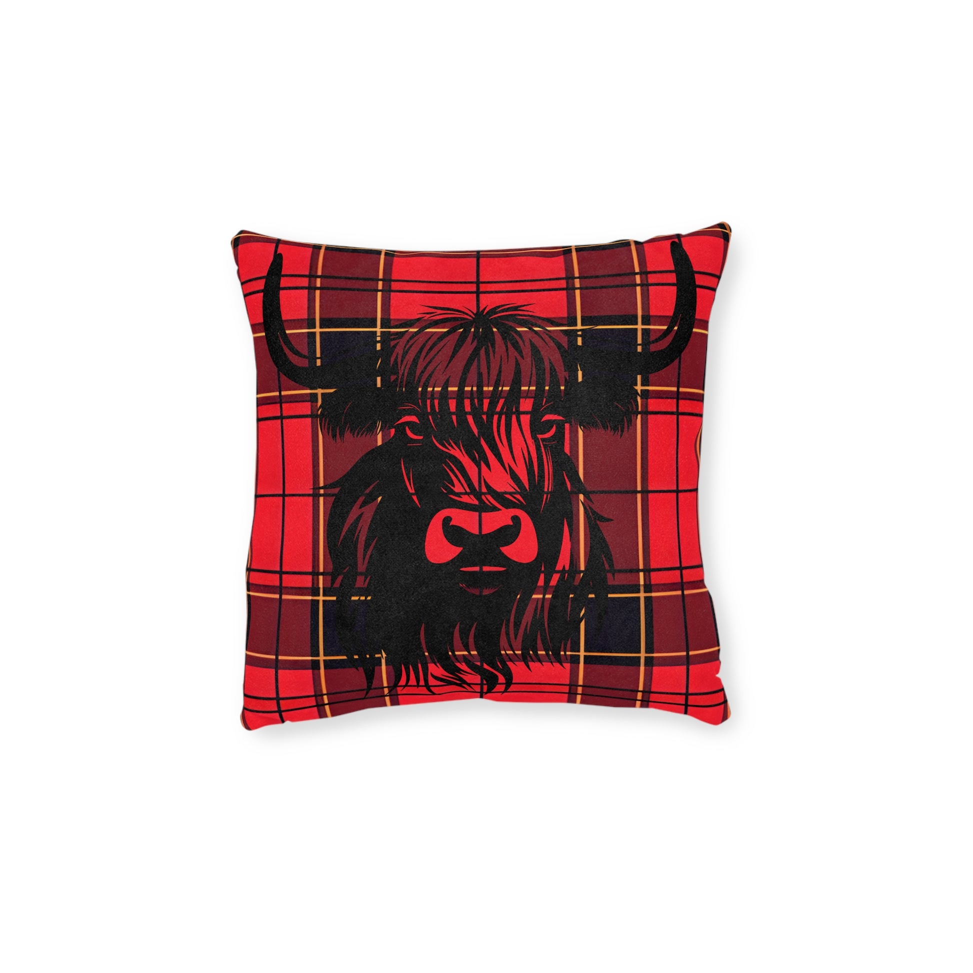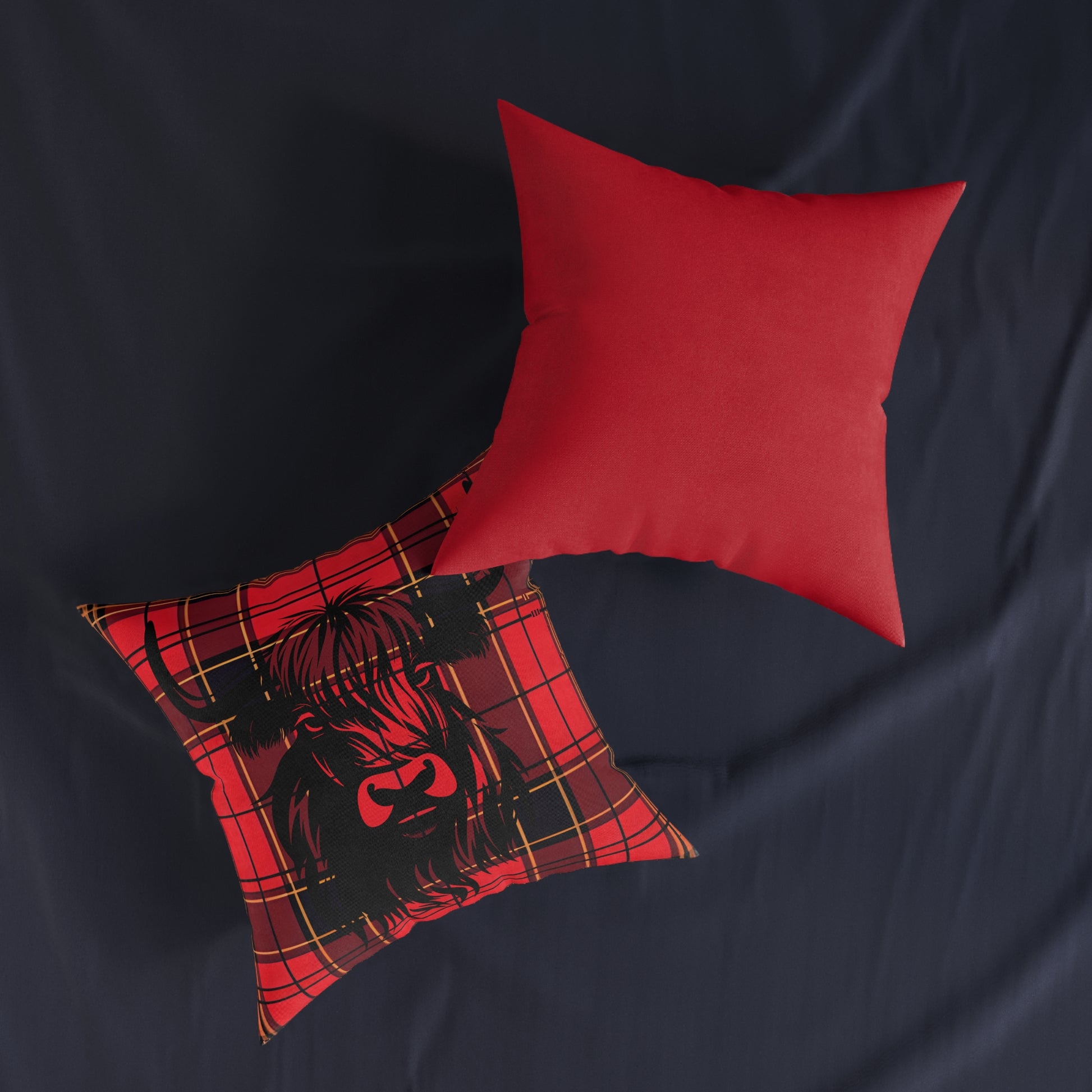 Cozy Highland Cow Pillow, Farmhouse Square Cushion, Rustic Home Decor, Red Plaid Throw Pillow, Great for Living Room, Cabin Style