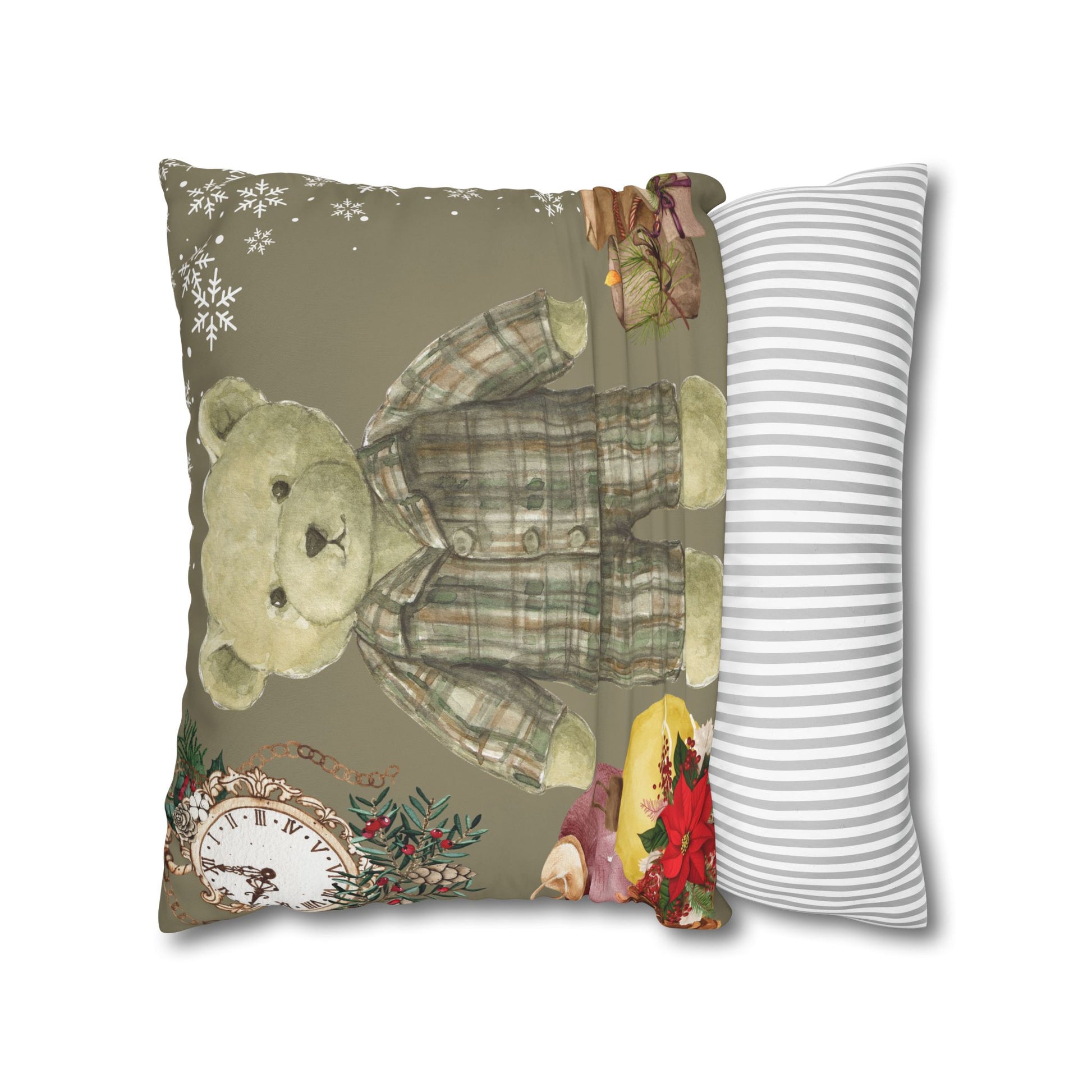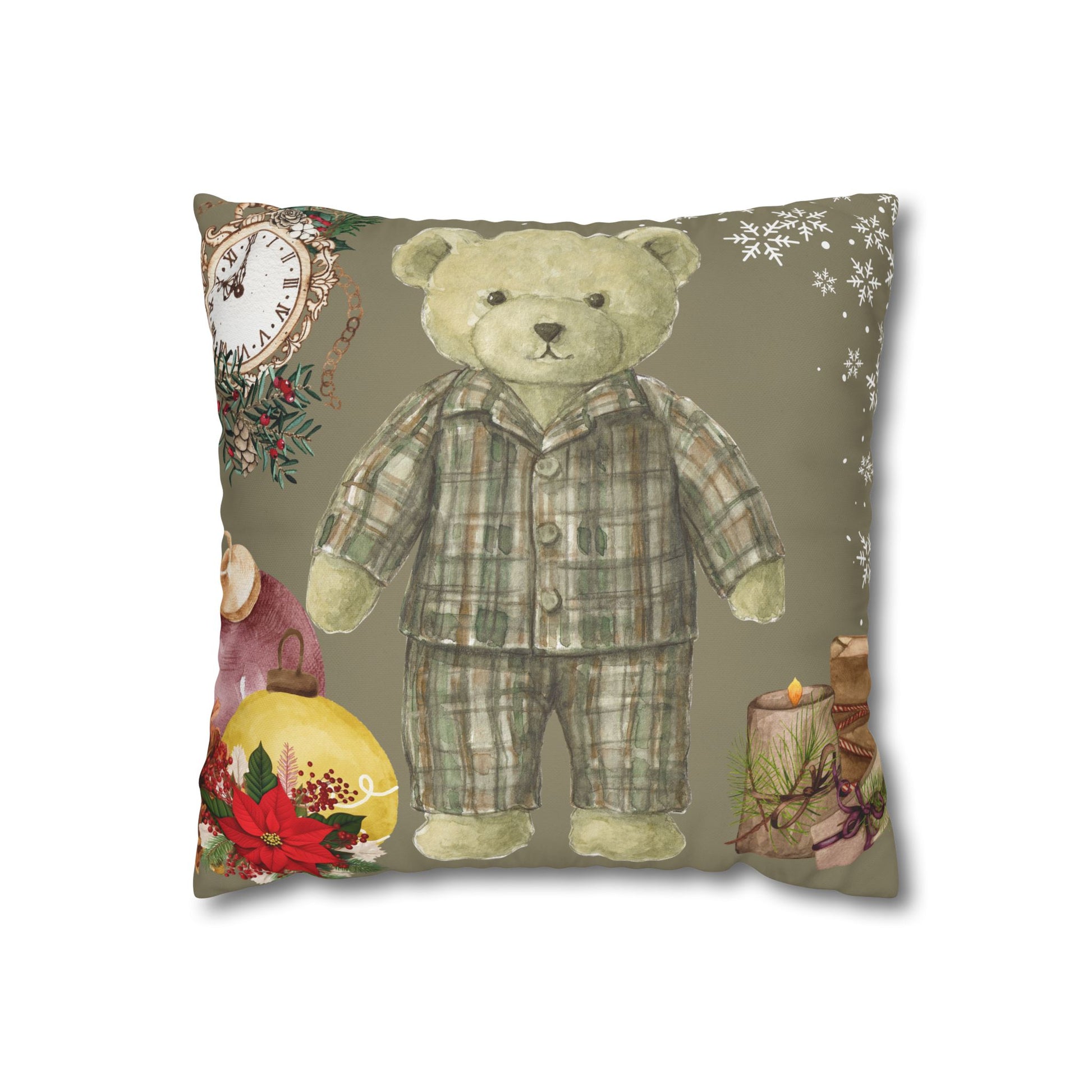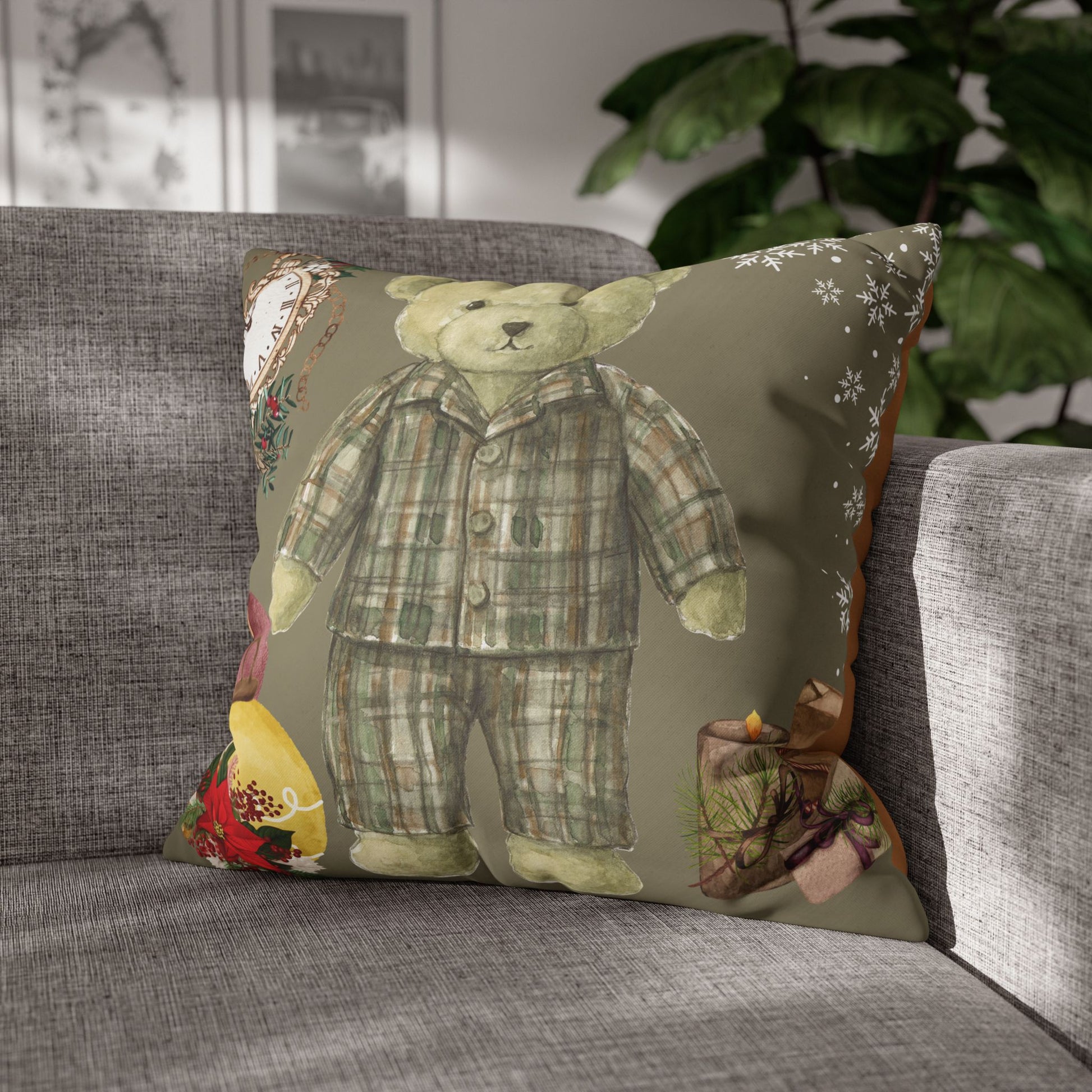 Bring a soft touch of nostalgia to a cozy corner with this square poly canvas pillowcase. The artwork—featuring a vintage-style teddy in plaid pajamas surrounded by classic ornaments and a ticking clock—creates a warm, storybook mood that settles into quiet evenings, nursery nooks, or holiday-reading chairs. The print wraps the whole cover for a painterly, double-sided look, and a hidden zipper keeps the silhouette clean while making it easy to insert and remove your pillow. Colors stay bright and detailed thanks to advanced printing on a fine-weave polyester canvas that feels gentle against skin. Use it to add a calm, wistful accent that complements layered throws and wooden or upholstered furniture during winter gatherings or slow weekends at home.